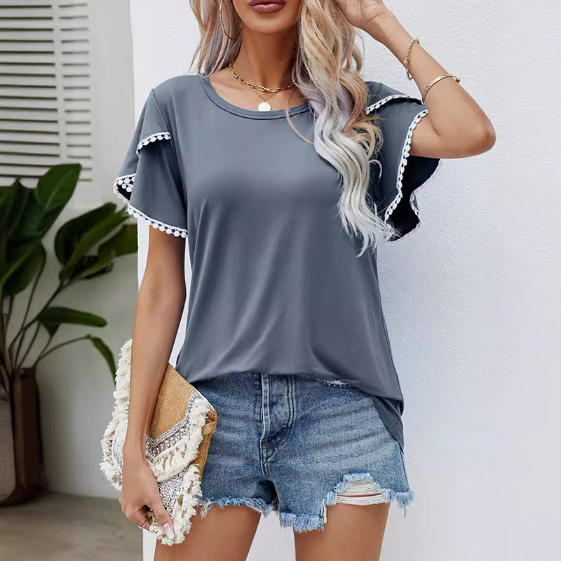 T-shirt décontracté à col rond et manches à pompons pour femme
